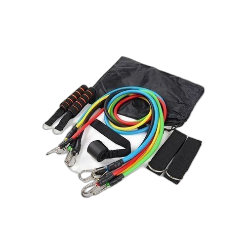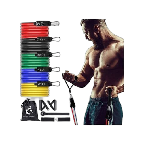 - Ensemble de 11 pièces : Comprend 5 bandes de résistance de différentes couleurs (noir, bleu, rouge, vert, jaune), 2 poignées rembourrées, 1 ancrage de porte, 2 sangles de cheville et un sac de transport pratique.