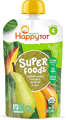 Aliment biologique pour bébé happy family usda stage 4 contient de la poire, de la mangue, des épinards et du chia super chia refermable sans ogm – 120 g.