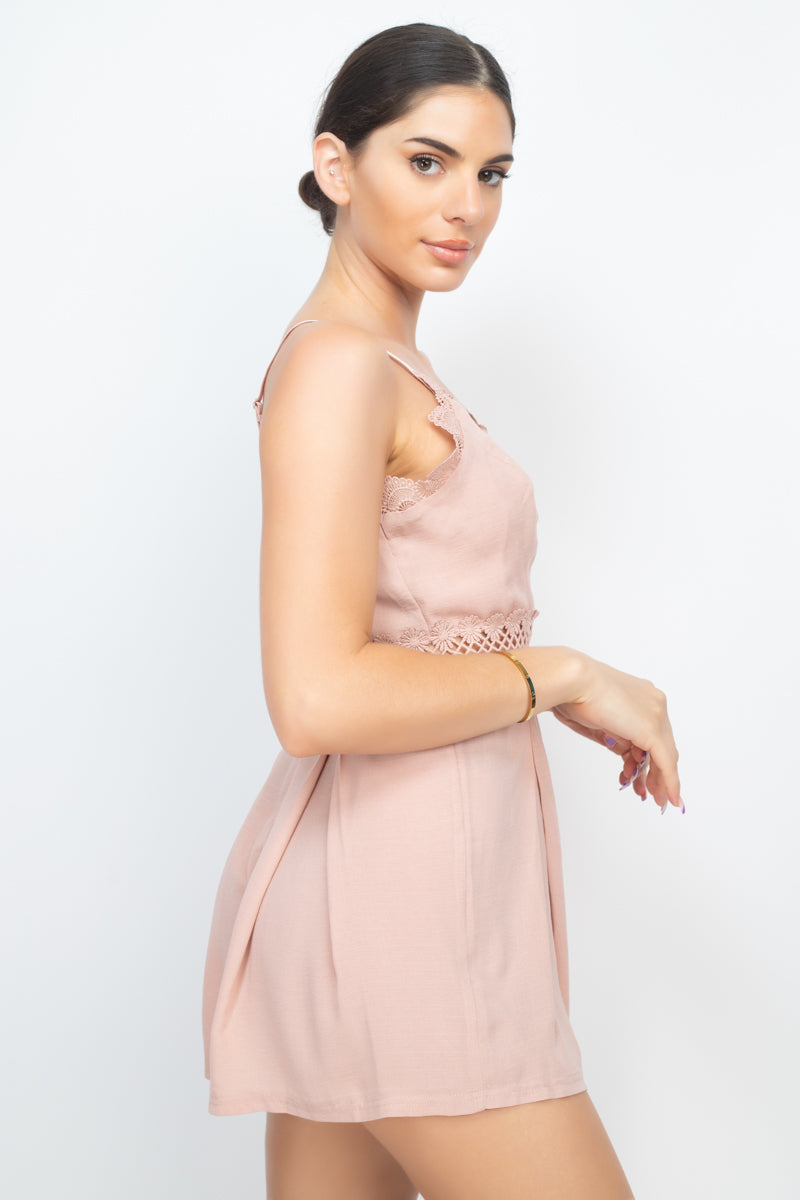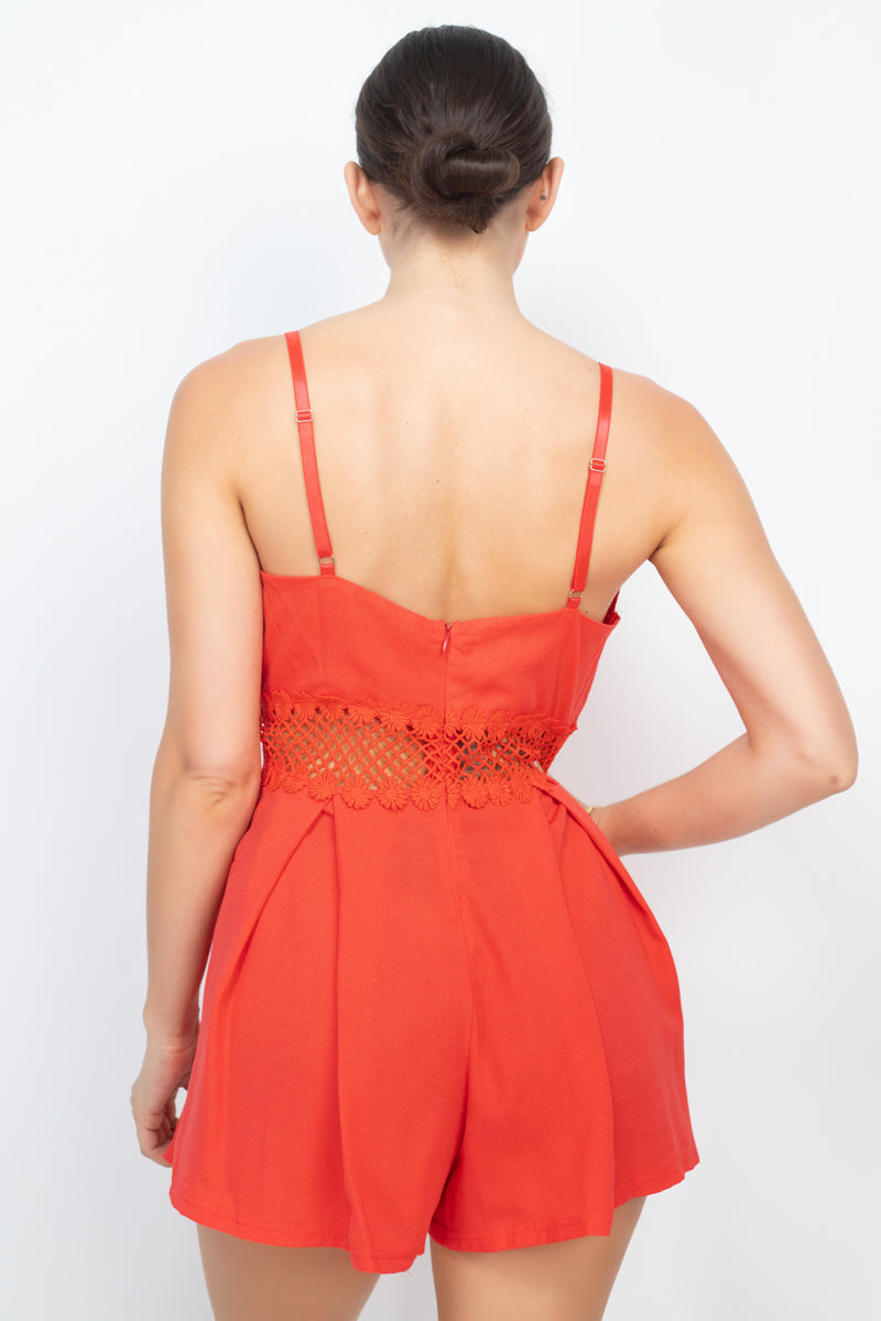 Une barboteuse tissée unie avec des détails en dentelle, une taille croisée, une broderie florale, un design plissé, des bretelles caraco réglables et une fermeture zippée au dos