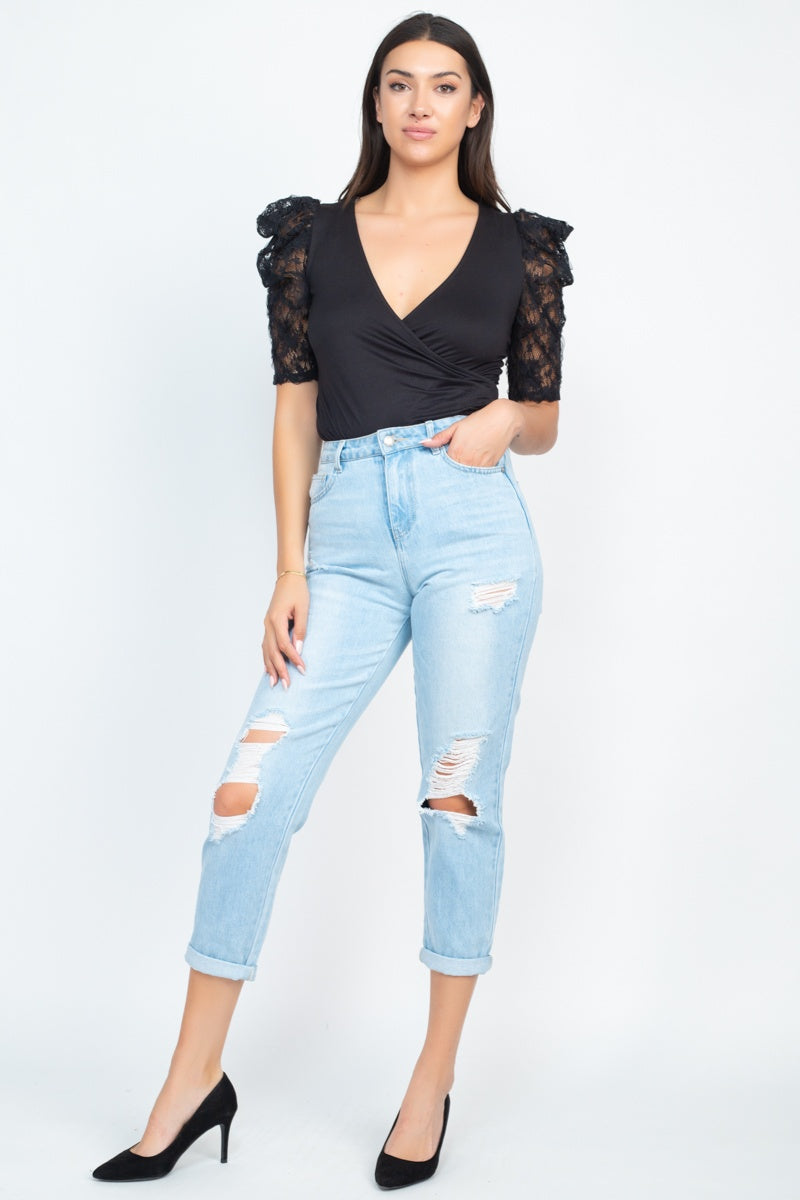 Un body en tricot de couleur unie, avec bordure en dentelle, manches courtes bouffantes, encolure à surplis et motif superposé sur le devant..