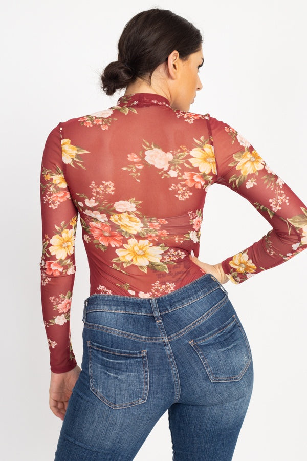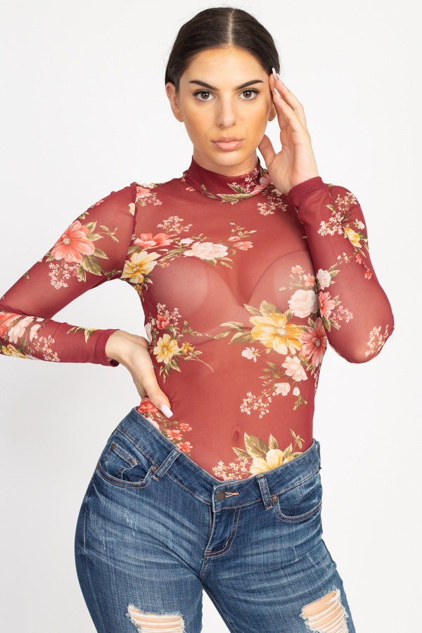Un body en tricot transparent avec un imprimé floral sur l’ensemble, un col montant, des manches longues, une silhouette ajustée et des fermetures inférieures à boutons-pression.