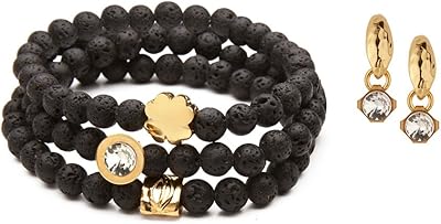 Bracelet extensible de boucles d’oreilles noires ca smadar magnifiquement conçu avec des pierres de lave, des cristaux swarovski et des éléments plaqués or 24 carats avec boucles d’oreilles assorties.