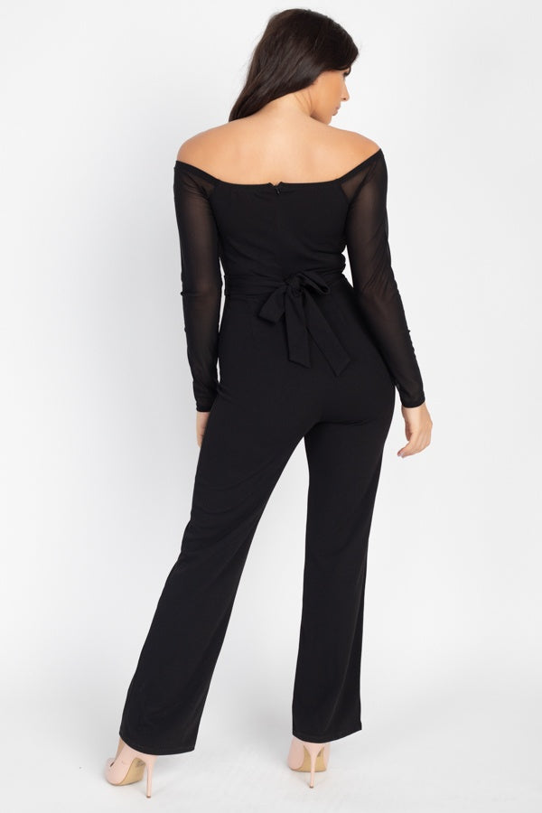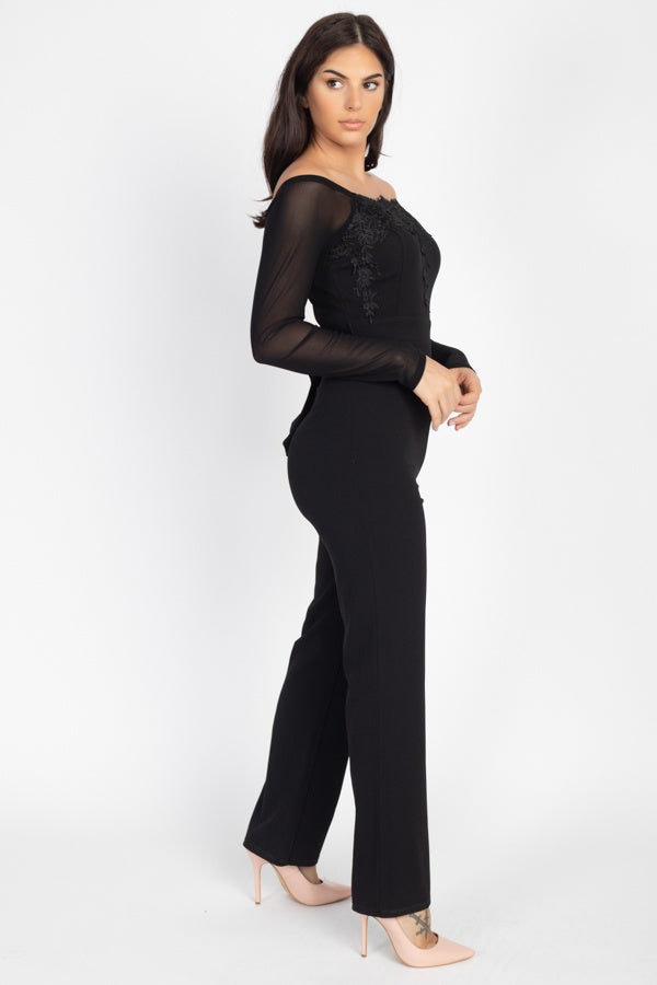 Combinaison en tricot avec encolure carrée, manches longues en maille transparente, motif brodé en dentelle sur le buste, taille cintrée, ceinture à nouer attachée, dos élastiqué, fermeture éclair dissimulée au dos et jambe large.