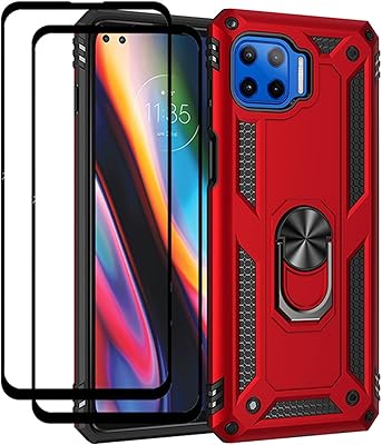 Coque de protection hybride robuste double couche anti-rayures avec protecteur d’écran en verre trempé [2 pièces], pour motorola moto g 5g plus (rouge).