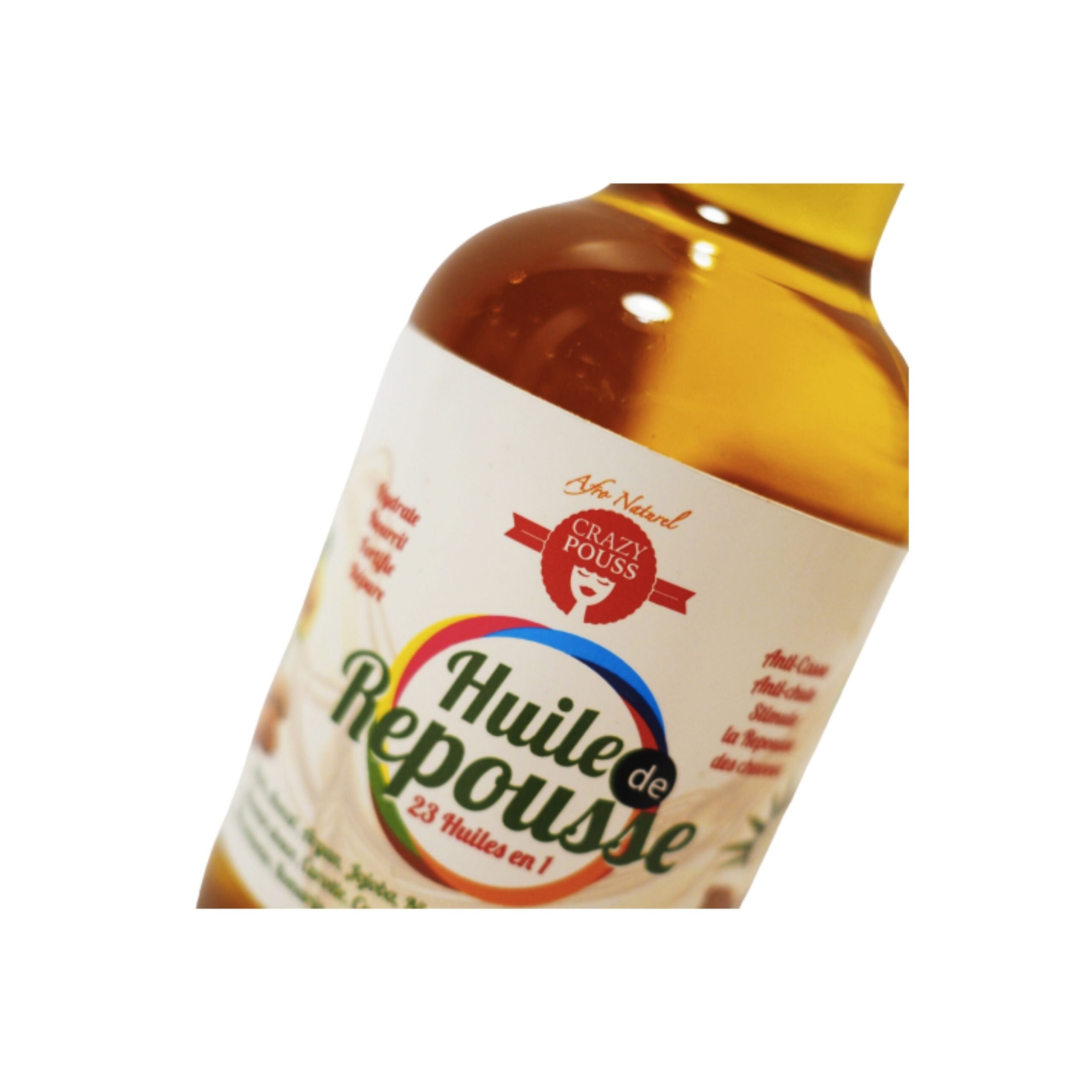 L’huile de repousse Crazy Pouss est un concentré de 23 huiles. Utilisée quotidiennement, elle apporte force et vitalité à la fibre capillaire. Réduit la chute.