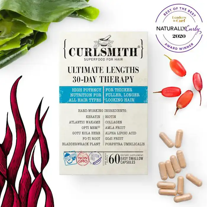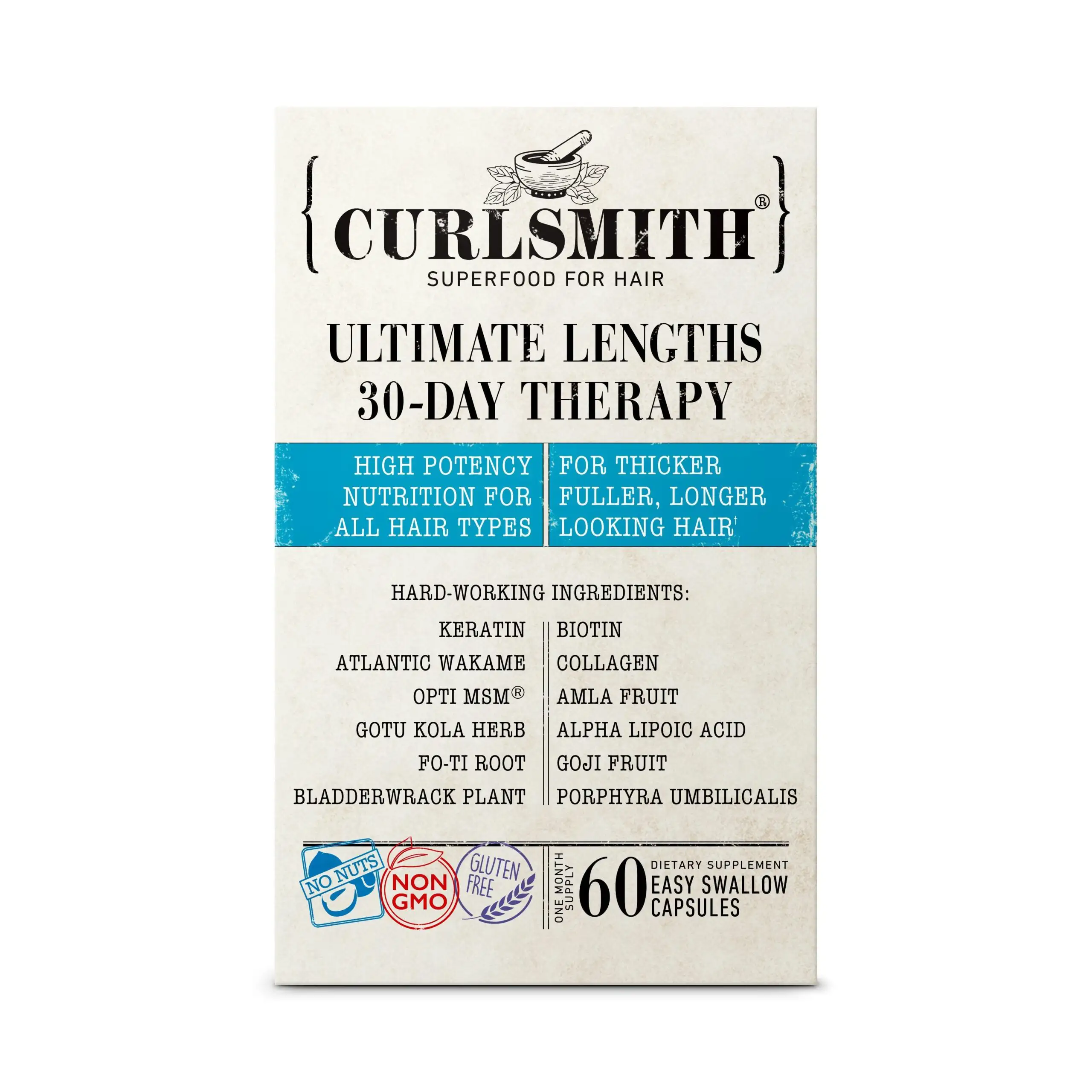 Naturally Curly Best of the Best Leaders in Curl Awards 2020. La recherche montre que toute une gamme de facteurs, notamment le stress, les changements hormonaux, le surstyle, une mauvaise alimentation, l âge, la ménopause, la post-grossesse et les médicaments peuvent avoir un impact sur la santé des cheveux et des cheveux. croissance. Une femme sur deux a déclaré avoir ressenti la détresse que cela peut causer à un moment donné de sa vie. Curlsmith Ultimate Lengths 30-Day Therapy est scientifiquement formulé avec un complexe exclusif qui aide à nourrir les cheveux clairsemés et à favoriser la croissance des cheveux existants de l intérieur. Nous avons inclus tout ingrédients nécessaires à la santé des cheveux : Kératine, Collagène, Biotine et OptiMSM, associés à un mélange d actifs naturels puissants. Ces nutriments aident à nourrir vos cheveux pendant la phase anagène du cycle de croissance des cheveux et à les faire prospérer. les directions Prendre 2 capsules par jour avec un repas. Quel goût ça a : Pas de saveur Quand s attendre à des résultats : Huit à douze semaines Format : Petites capsules faciles à avaler Autres informations : convient à tous les types de cheveux et à tous les sexes