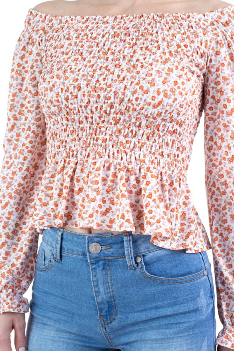 Un haut court en tricot à imprimé floral avec de longues manches paysannes, une encolure carrée, une smockée, peut être porté sur les épaules dénudées et un ourlet à basque.