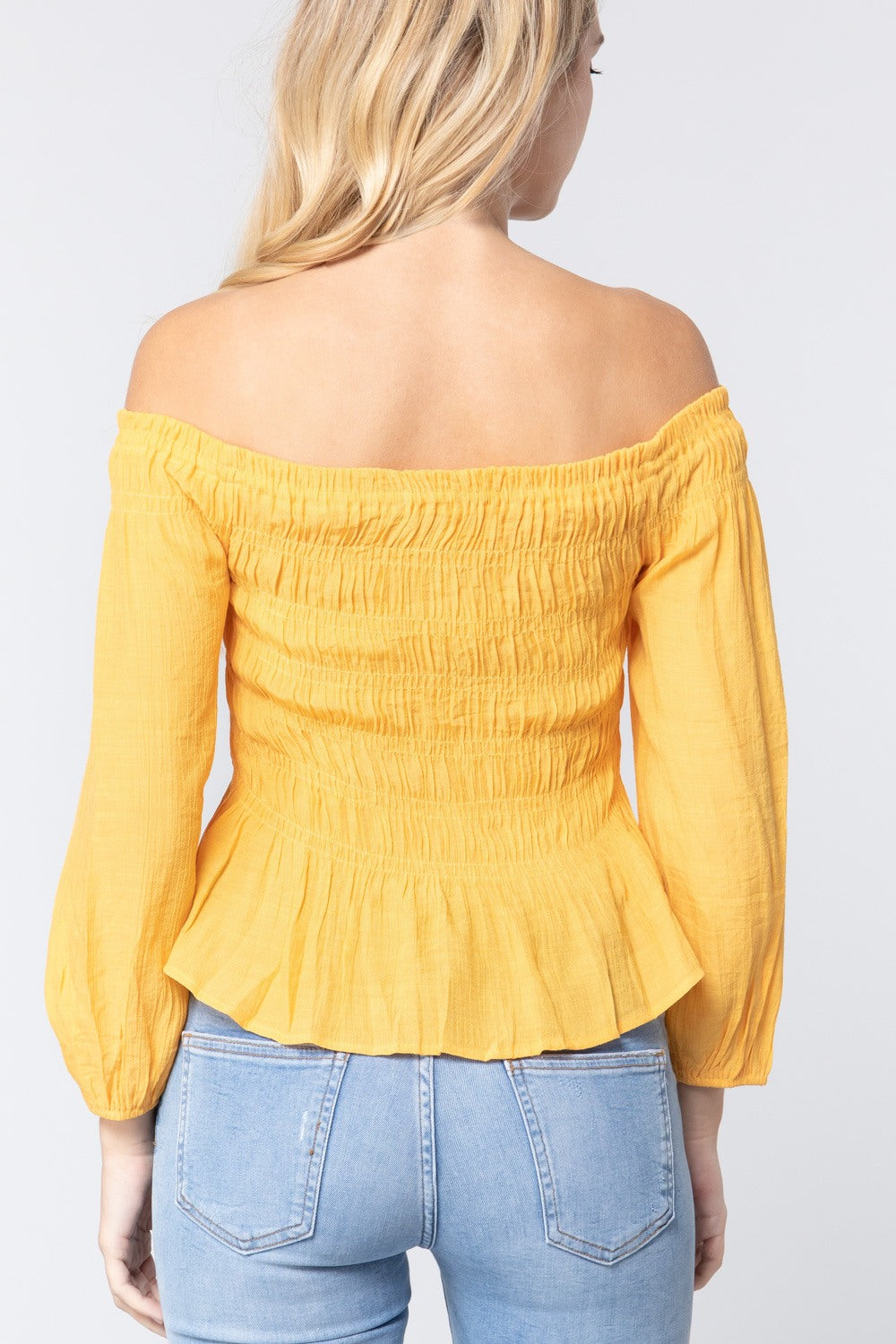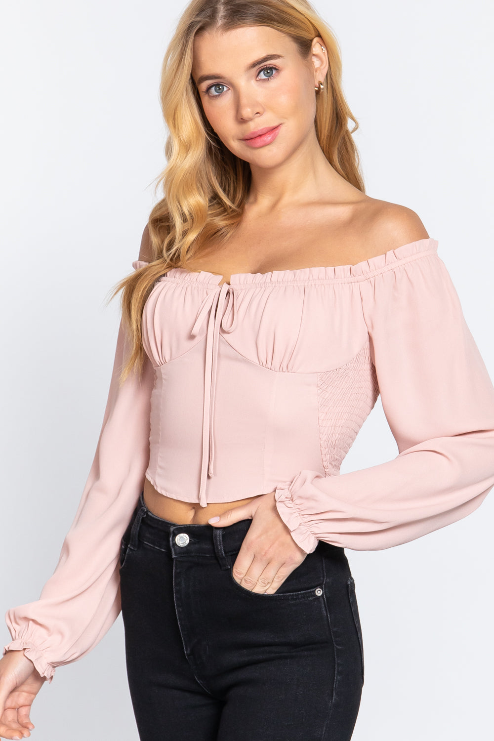 HAUT TISSÉ À MANCHES LONGUES SUR L’ÉPAULE AVEC DÉTAILS SMOCKÉS AU DOS VOLANT