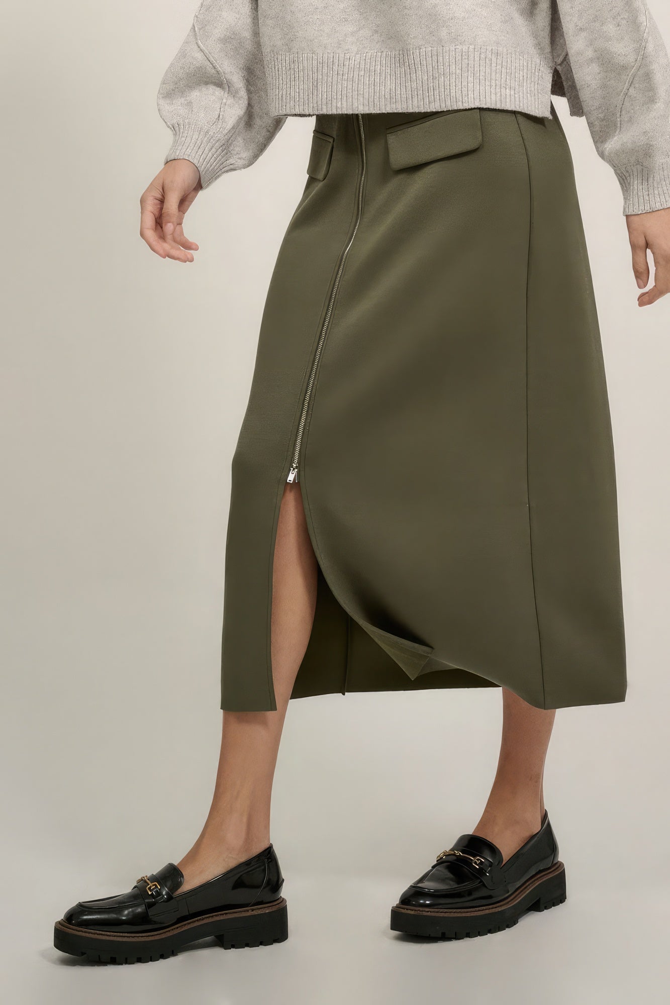 Faites une déclaration avec notre jupe midi unie taille haute avec fermeture éclair et fente sur le devant en vert sourd. Ajoutez-le à votre panier maintenant et profitez du mélange parfait de mode et de confort !