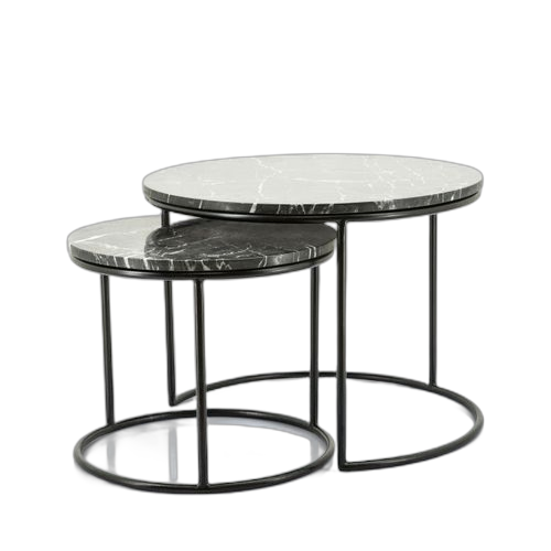 Chacune des tables est dotée d’un plateau rond en marbre d’épaisseur moyenne, soutenu par un piètement en métal robuste. Le design est soigneusement pensé, avec trois pieds fins cylindriques pour chacune, garantissant une stabilité optimale. La plus petite table arbore une base ronde, tandis que la seconde se distingue par une base en forme de croissant, permettant de les imbriquer facilement.