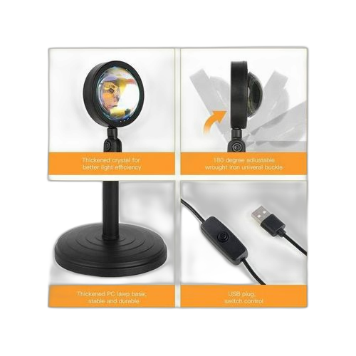 Mythco lampe/projecteur coucher de soleil 20 couleurs avec télécommande alimentée par usb; 16 Couleurs RGB Multiples – La version améliorée de la lampe coucher de soleil offre 16 couleurs. Un large éventail de couleurs vous donne plusieurs modes d\’éclairage en option. Il vous suffit de contrôler avec la télécommande, vous pouvez choisir l\’effet lumineux souhaité à tout moment.Angle Ajustable à 360° – La lampe coucher de soleil contient un câble USB de 2 mètres avec interrupteur, la tête peut être tournée à 360 degrés. La taille et la forme de l\’aura peuvent être ajustées en tournant la tête de la lampe pour répondre à vos besoins d\’éclairage.4 Modes de Réglage – La version améliorée de la lampe coucher de soleil propose 4 modes de réglage : Effet Saut, Effet Stroboscopique, Effet Dégradé, et Dégradé Doux. Les lumières LED peuvent être contrôlées par télécommande. Vous pouvez ajouter plus d\’ambiance à la fête des mères à tout moment.Lentille Cristal HD – La lampe de projection coucher de soleil est équipée d\’une lentille cristal HD épaissie. Une forte transmission de la lumière, une surface d\’émission plus large, une distance plus éloignée et une plus grande portée de projection. Créez des effets lumineux nocturnes encore plus beaux. Économie d\’énergie et durée de vie de 50 000 heures avec des LED de haute qualité.Utilisation Polyvalente – La lumière douce du coucher de soleil est parfaite pour l\’éclairage de nuit, la photographie, les vlogs, les selfies, les fêtes, les célébrations de la fête des mères, les anniversaires. Convient pour décorer le salon, les chambres, le jardin, créant une atmosphère différente de lumière de projecteur coucher de soleil, vous permettant de profiter de votre temps libre en famille. C\’est un cadeau incroyable pour votre épouse et vos amis.Caractéristiques :16 Couleurs RGB pour Lumières de Coucher de SoleilAngle ajustable à 360°4 Modes de RéglageTélécommandeLuminosité RéglableLumière douce sans scintillementFaible consommation d\’énergieLentille Cristal HDContenu de l\’emballage :1 x Lampe de Projection1 x TélécommandeREMARQUE :La télécommande est déjà équipée de piles. Retirez la carte transparente sur le couvercle arrière de la télécommande avant de l\’utiliser.Lors de l\’utilisation de la télécommande, vous devez la diriger vers l\’avant du corps de la lampe pour garantir qu\’il n\’y a pas d\’obstacles interférents entre la télécommande et la lampe.Après la mise sous tension de la lampe, le mode par défaut est le mode clignotant, ce qui est un phénomène normal. Cliquez sur le bouton de couleur de la télécommande pour changer la couleur souhaitée.La tête de charge n\’est pas incluse dans l\’emballage. Vous aurez besoin d\’une tête de charge USB A.