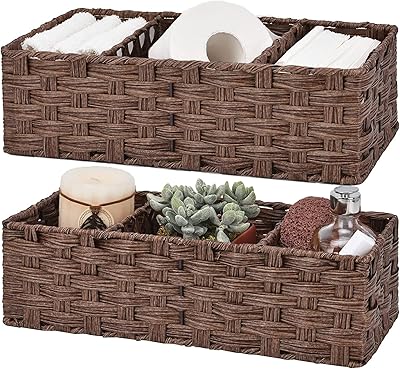 Paniers de rangement de salle de bain, panier de rangement de toilettes étanche, panier en rotin avec 2 séparateurs, marron, paquet de 2.