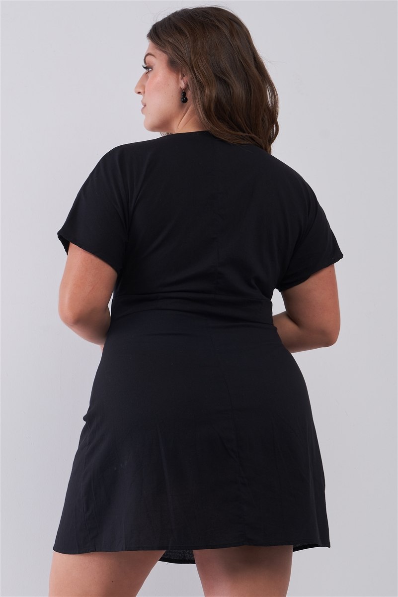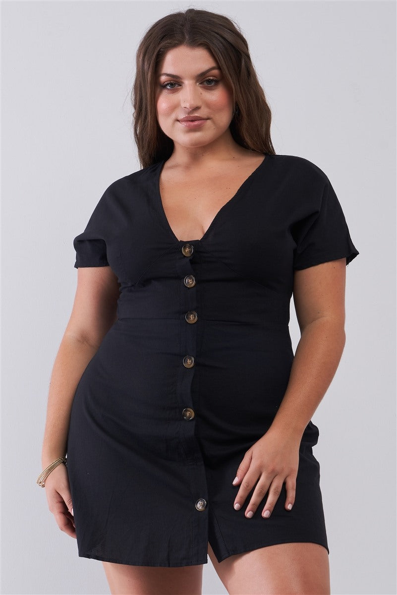 Noir, uni, manches courtes, encolure en V, boutonné sur le devant, bouton marbré marron, ajusté, longueur mini, sans doublure, non extensible, 100 % coton, respirant, sexy, tendance, plus grande tendance estivale, incontournable cette saison< br>100% Coton