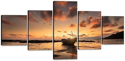 Qqyyyt 5 pièces de peinture murale toile affiche mur art image bateau de pêcheur plage coucher de soleil paysage sur la plage bureau créatif moderne classique fitness.