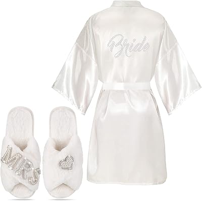 2 PIÈCES CADEAUX DE MARIÉE ROBE DE MARIÉE AVEC PANTOUFLES EN SATIN STRASS