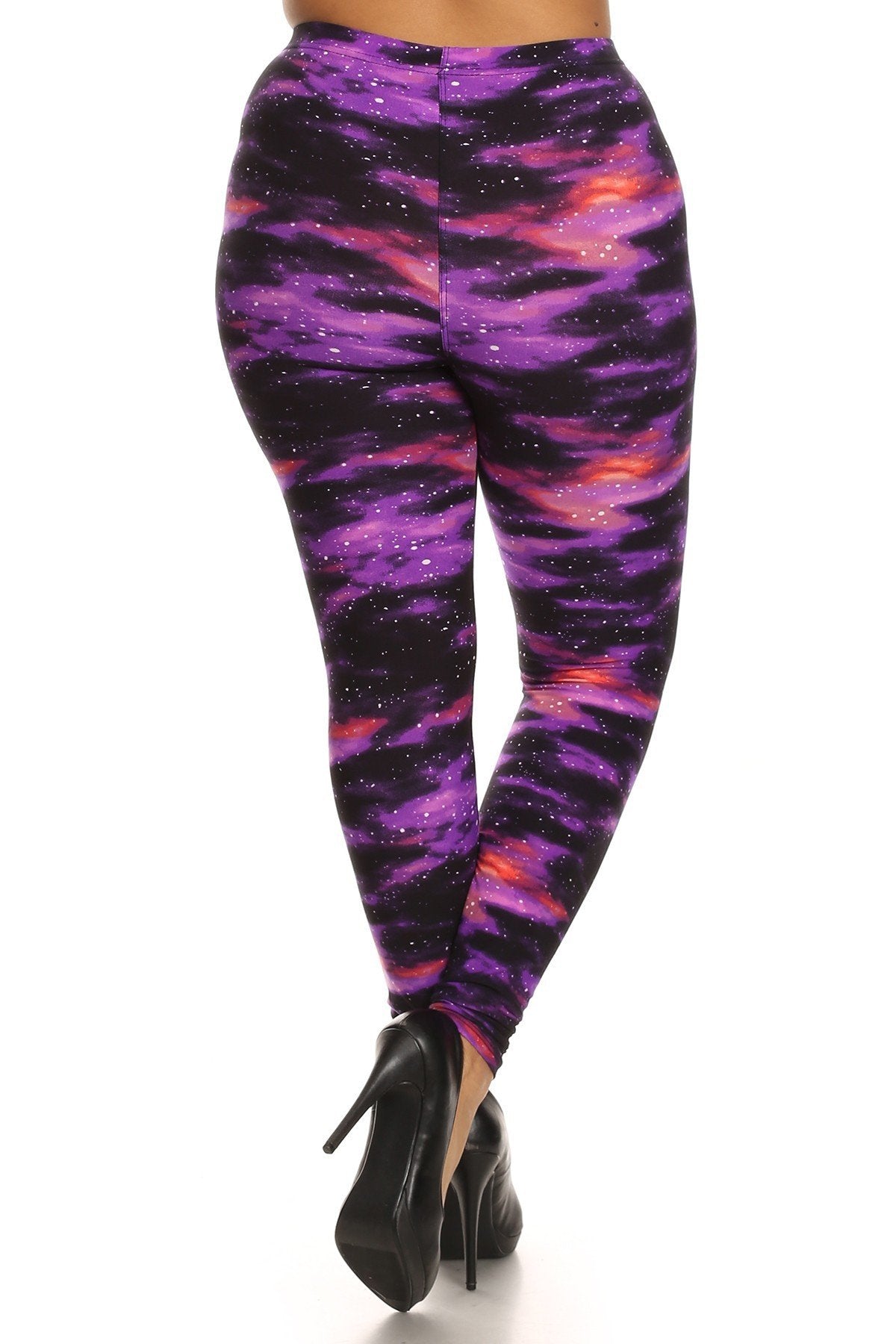Tissu peau de pêche super doux grande taille, legging en tricot imprimé graphique galaxie avec détail élastique à la taille. Coupe taille haute