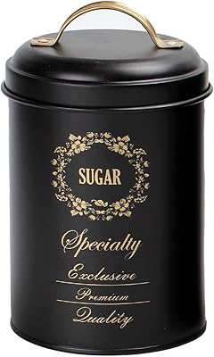 Un contenant à sucre conçu avec un logo doré de cuisinart, avec un couvercle en métal et une poignée dorée – couleur noire.