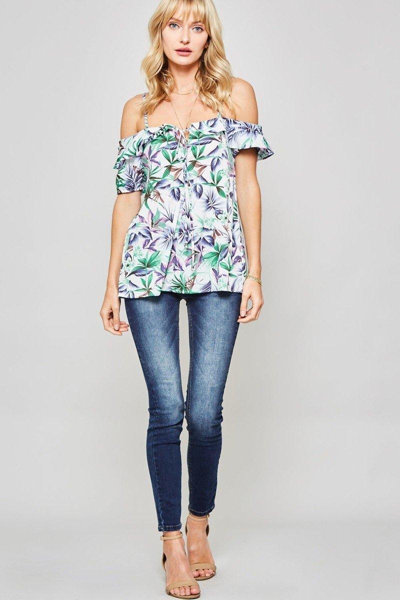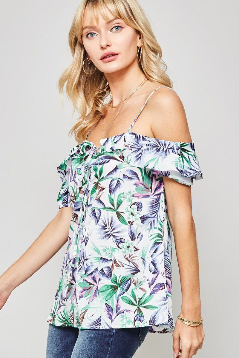 Un haut tissé à imprimé floral avec une encolure à épaules dénudées à volants, une fermeture à nouer sur le devant avec trou de serrure, des manches courtes élastiquées et des bretelles caraco réglables.